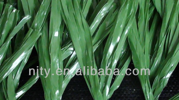 คือหญ้าที่มีเส้นใยที่ผลิตจาก PE หรือ PP เป็นเส้นใยแบบรวงผึ้ง หรือตาข่าย ที่มีแกนเดี่ยว ที่มีขนาดใหญ่ เมื่อสัมผัสเส้นใยจึงมีความรู้สึกแข็งและหยาบกระด้างมากกว่าเพราะมีแรงฝืดจากแกนหญ้าร่วมกันนั่นเอง การผลิตให้เป็นผืนได้โดยการนำเส้นใยดังกล่าวมาถักทอในแผ่นรองพื้นหรือ Backing ดังนั้นใน 1 รูของฝีเข็มจึงมีการถักทอได้เพียง 1 – 2 เส้นใยเท่านั้น เมื่อใช้งานผ่านไปสักระยะจะมีการแตกตัวเป็นเส้นหญ้าใบเล็ก และเมื่อหลุดจากรูของฝีเข็มจะหลุดทั้งยวง ทำให้ในบางสนามที่ใช้หญ้าใบใหญ่จะสังเกตเห็นหญ้าสีขาวที่นำมาถักทอเป็นเส้นขาวนั้นหลุดอยู่ในสนามได้อย่างชัดเจน ดังนั้นหญ้าใบใหญ่จึงนิยมทอกับ Backing ที่มีความหนา 3 ชั้น หรือ Backing ที่เคลือบด้วย Polyurethane (จะมีลักษณะเป็นสีเงาๆ) เพื่อป้องกันการหลุดร่วงของเส้นหญ้าที่จะเกิดขึ้นในอัตราเร่งที่สูงมากเมื่อ Backing เริ่มมีการเสื่อมสภาพ ดังนั้นอายุการใช้งานหรือการเสื่อมสภาพของหญ้าเทียมนี้จึงขึ้นอยู่กับอัตราการแตกตัวของใบหญ้าจากใบใหญ่ มาเป็นใบเล็ก (แต่ยังอยู่ในแกนเส้นใยเอกเทศร่วมกัน) ซึ่งเมื่อมีการสัมผัสที่มากขึ้นก็หมายถึงแกนเดี่ยวที่ขยับพร้อม ๆ กัน ซึ่งส่งผลให้เกิดการหลวมของรูฝีเข็มได้เร็วขึ้นด้วยเช่นกันนั่นเอง